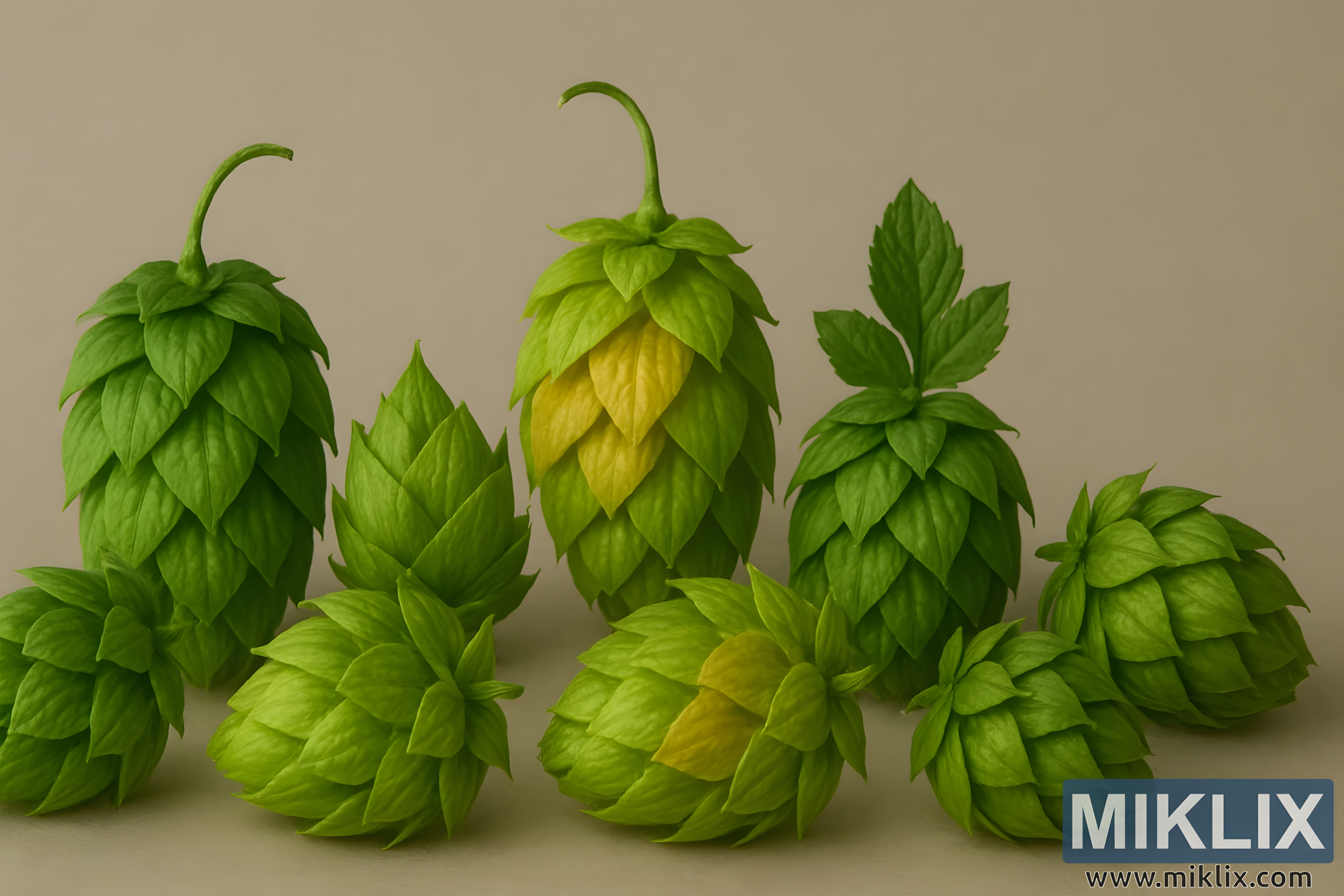 Isithombe sibonisa ukuhlelwa kwempilo emile yamakhoni e-hop, aboniswa ngokucophelela ngokumelene nesizinda esimaphakathi se-beige. Ukwakheka kugqamisa amakhoni e-hop ayisikhombisa esewonke, kusukela kokusha, okuluhlaza okotshani kuya kumathunzi aluhlaza-sagolide ahlaba kancane, amele ukuhlukahluka okucashile kokuvuthwa ngaphandle kokuphambukela kokunsundu noma amathoni asemhlabeni ajulile ezigaba zakamuva. Ikhoni ngayinye ithwetshulwa ngokucacile okuphawulekayo, iveza ama-bracts ayo anezingqimba, anjengesikali ahlelwe ngokuzungeza okugqagqene. Ukuthungwa kwama-cones kokubili kuthambile futhi kuyinkimbinkimbi, kufana nomfanekiso wezitshalo owenziwe imvelo ngokwayo.
