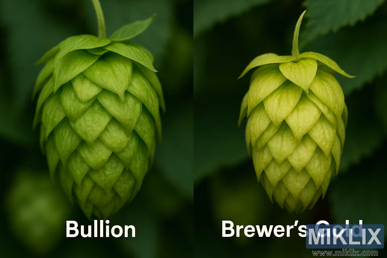 Sekukonke, isithombe sisebenza njengokuqhathanisa okubonakalayo kokufundisa nobuhle. Igqamisa ama-nuances we-morphological ahlukanisa i-Bullion ne-Brewer's Gold hops—izinhlobo ezimbili ezibalulekile zomlando ekwenziweni kokuphisa—ngenkathi kubungazwa ubuhle bama-hop cones ngendlela yawo yemvelo. Ilungele ukusetshenziswa kumhlahlandlela wokwenza utshwala, izinkomba zezolimo, noma izinto zokukhangisa zikabhiya, lesi sithombe sihlanganisa ukuvumelana kokunemba kwesayensi nobuciko obubonakalayo obutholakala ekulinyweni kwe-hop nokuthwebula izithombe.