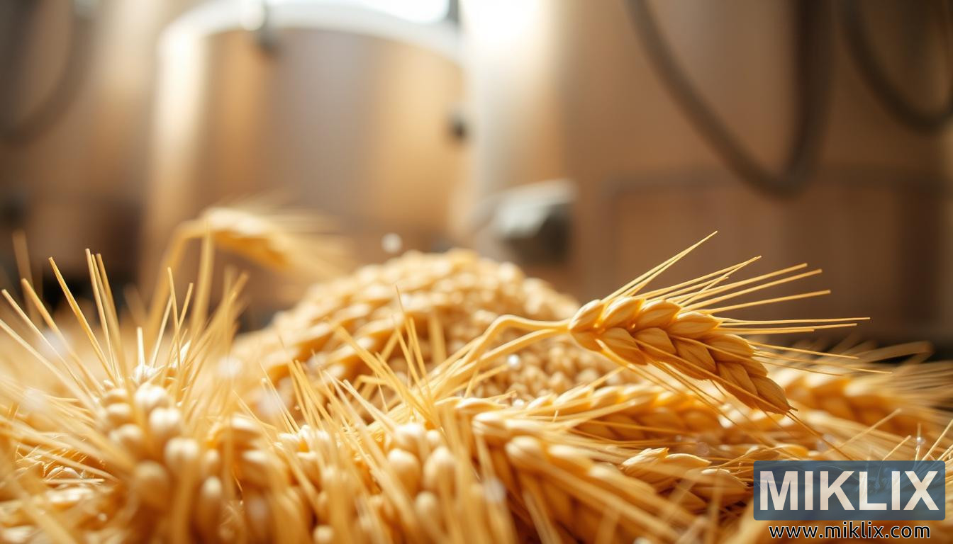 Izinhlamvu zikakolweni ezisanda kuvunwa kanye ne-malt kakolweni ogayiwe ziyabenyezela ngaphansi kokukhanya okufudumele, nge-mash tun silhouette ngemuva, egqamisa ubuciko bokwenza utshwala.